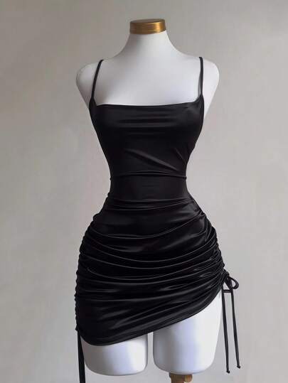 Chiquease Vestido Feminino com Decote Baixo, Detalhe Pregueado, Fenda Lateral e Gola Ombro a Ombro Simples